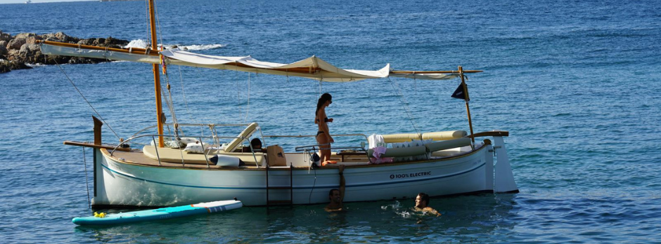Disfruta de la experiencia de navegar con un llaüt eléctrico por las calas de Puerto Portals.